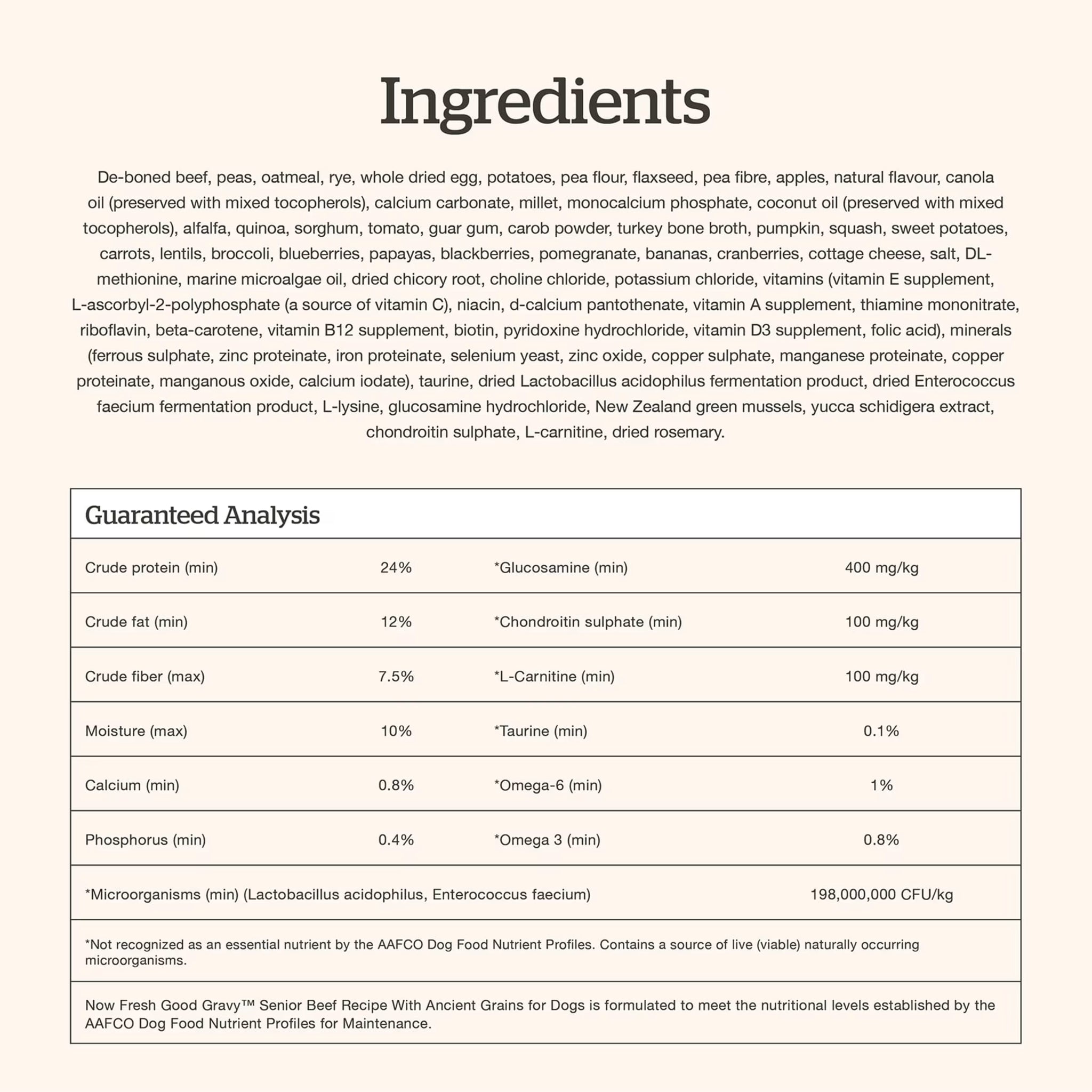 de-boned beef, peas, oatmeal, rye, whole dried egg, potatoes, pea flour, flaxseed, pea fibre, apples, natural flavour, canola oil (preserved with mixed tocopherols), calcium carbonate, millet, monocalcium phosphate, coconut oil (preserved with mixed tocopherols), alfalfa, quinoa, sorghum, tomato, guar gum, carob powder, turkey bone broth, pumpkin, squash, sweet potatoes, carrots, lentils, broccoli, blueberries, papayas, blackberries, pomegranate, bananas, cranberries, cottage cheese, salt, DL-methionine, marine microalgae oil, dried chicory root, choline chloride, potassium chloride, vitamins (vitamin E supplement, L-ascorbyl-2-polyphosphate (a source of vitamin C), niacin, d-calcium pantothenate, vitamin A supplement, thiamine mononitrate, riboflavin, beta-carotene, vitamin B12 supplement, biotin, pyridoxine hydrochloride, vitamin D3 supplement, folic acid), minerals (ferrous sulphate, zinc proteinate, iron proteinate, selenium yeast, zinc oxide, copper sulphate, manganese proteinate, copper proteinate, manganous oxide, calcium iodate), taurine, dried Lactobacillus acidophilus fermentation product, dried Enterococcus faecium fermentation product, L-lysine, glucosamine hydrochloride, New Zealand green mussels, yucca schidigera extract, chondroitin sulphate, L-carnitine, dried rosemary