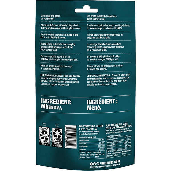 Go ahead, turn the bag around and look at the ingredients. PureBites® are made with only 1 ingredient; 100% Pure & Natural Ocean-Caught Minnow made in the USA. Cats love the taste of PureBites® because their treats are freeze dried RAW to lock in the aroma, texture and freshness they crave. Cat parents love PureBites® because their treats are 100% pure and rich in nutrients for a happy and healthy life.