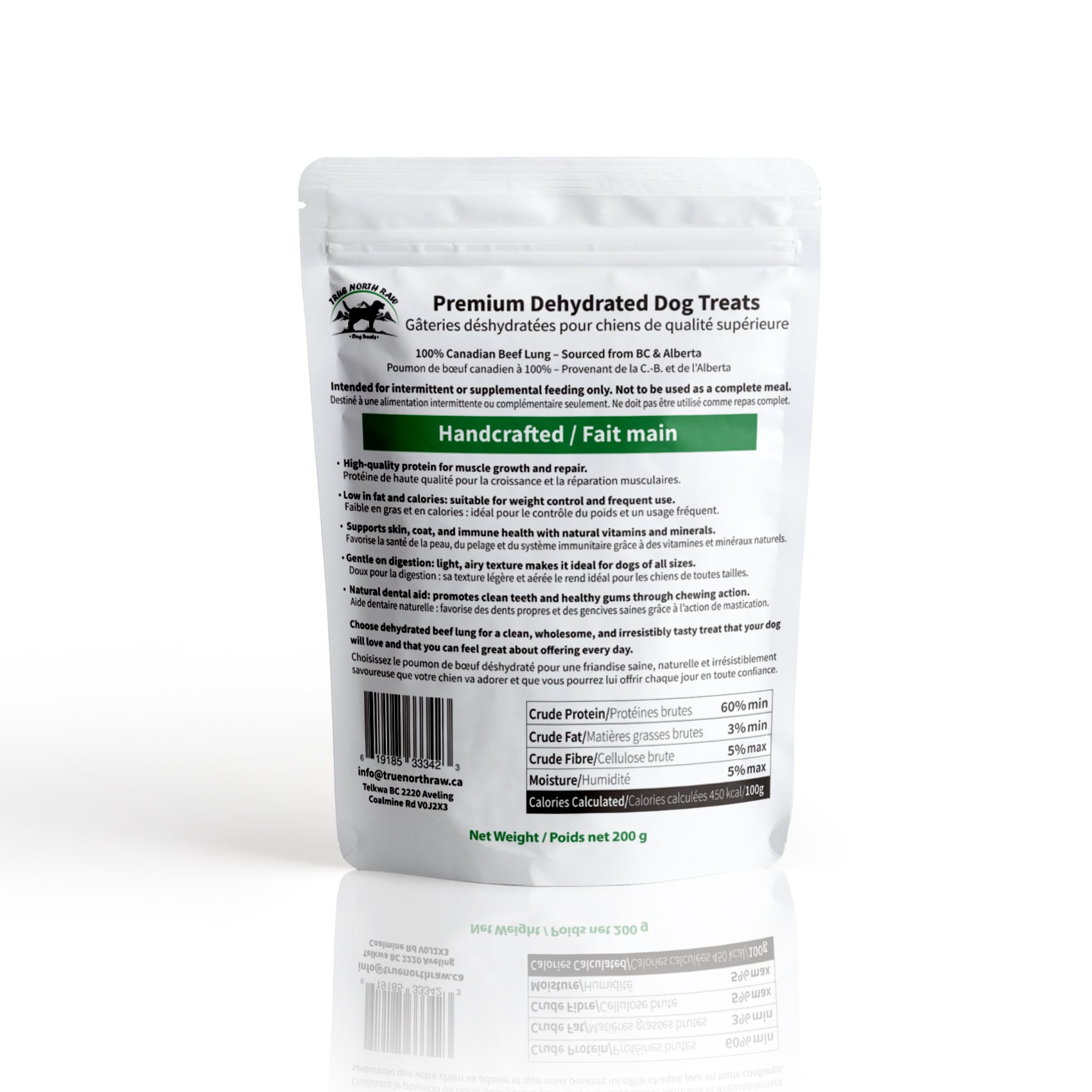 Premium dehydrated dog treats. 100% Canadian Beef Lung sourced from BC and Alberta. High quality protein for muscle growth and repair. Low in fat and calories for weight control and frequent use. Supports skin, coat and immune health with natural vitamins and minerals. Natural dental aid to promote clean teeth and healthy gums.